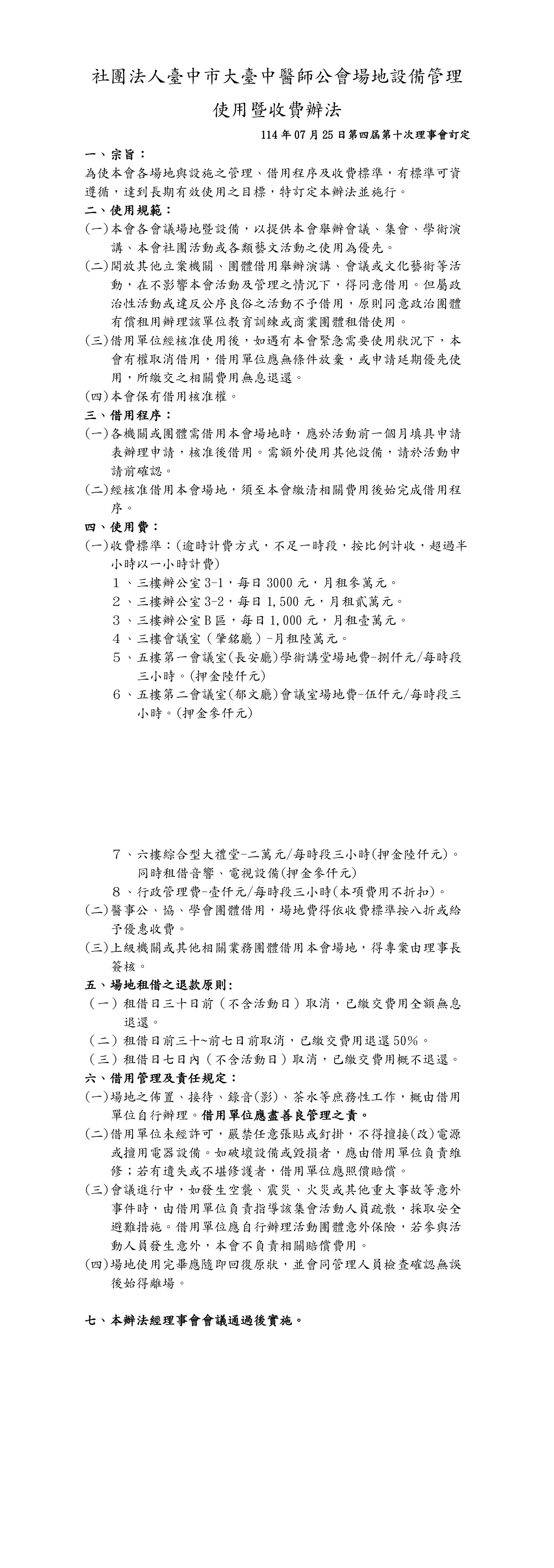 社團法人臺中市大臺中醫師公會場地設備管理使用暨收費辦法