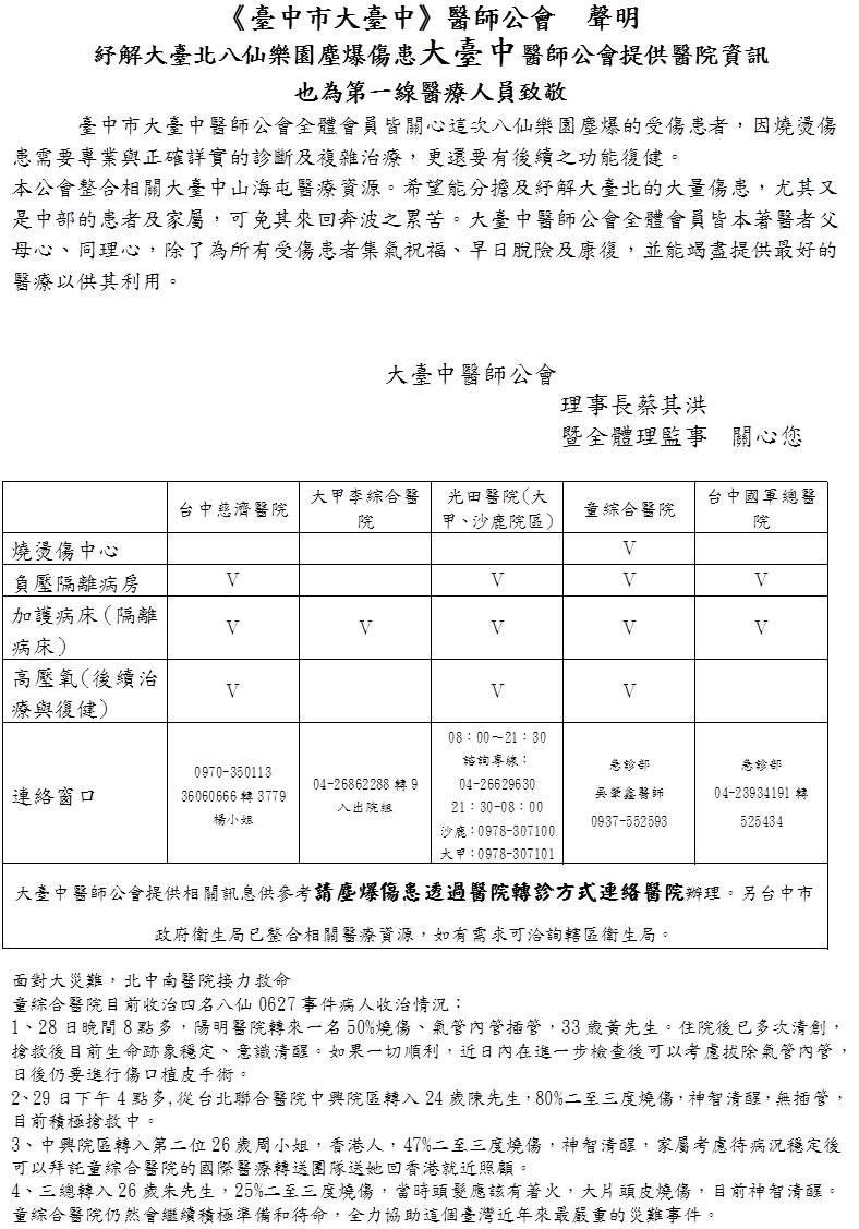 紓解大臺北八仙樂園塵爆傷患大臺中醫師公會提供醫院資訊也為第一線醫療人員致敬